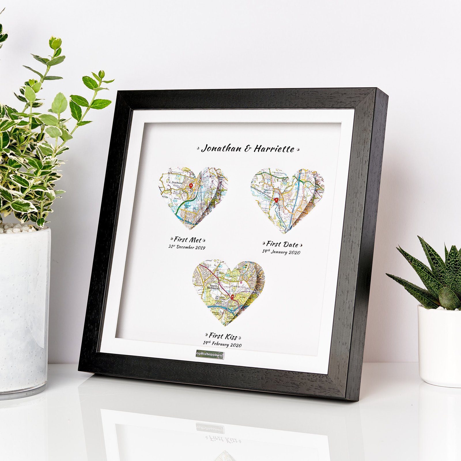 Our Heart Maps Anniversary Gift is a heartfelt and personalized way to commemorate the meaningful milestones of your relationship. Each heart-shaped map is custom-designed to showcase the exact locations of your first meet, first date, and first kiss, capturing the essence of your love story in a visually stunning and sentimental display. Whether you’re celebrating a milestone anniversary or simply want to show your partner how much their love means to you, this unique gift is a perfect way to cherish the moments that have brought you closer together.