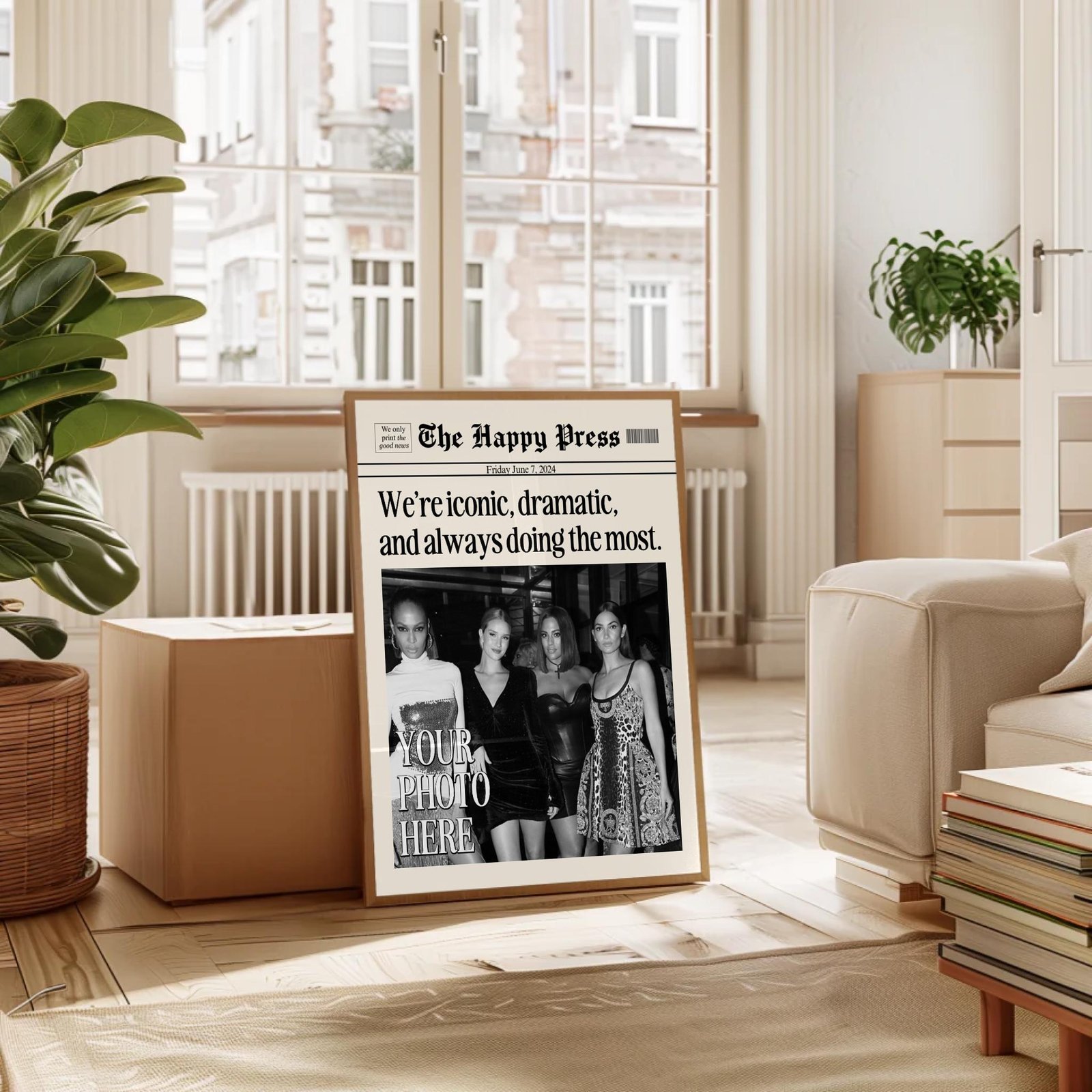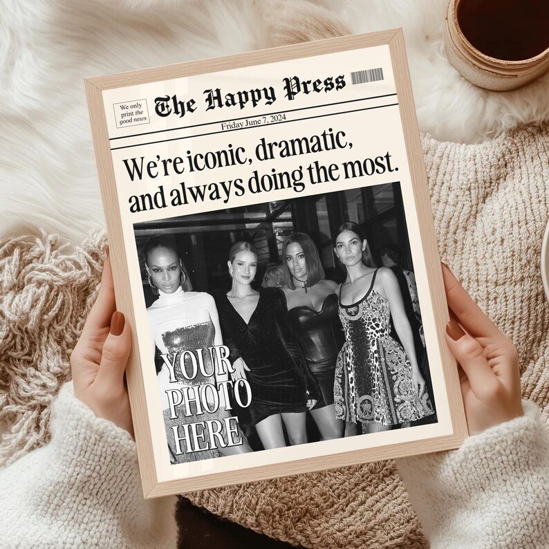 Make your memories timeless with this vintage-inspired custom newspaper print! Whether it’s for your dorm, living room, or as a heartfelt gift, this print will elevate any space with a unique personal touch. Upload your favorite photo, choose your headline, and let me create a piece that feels straight out of a classic newspaper!