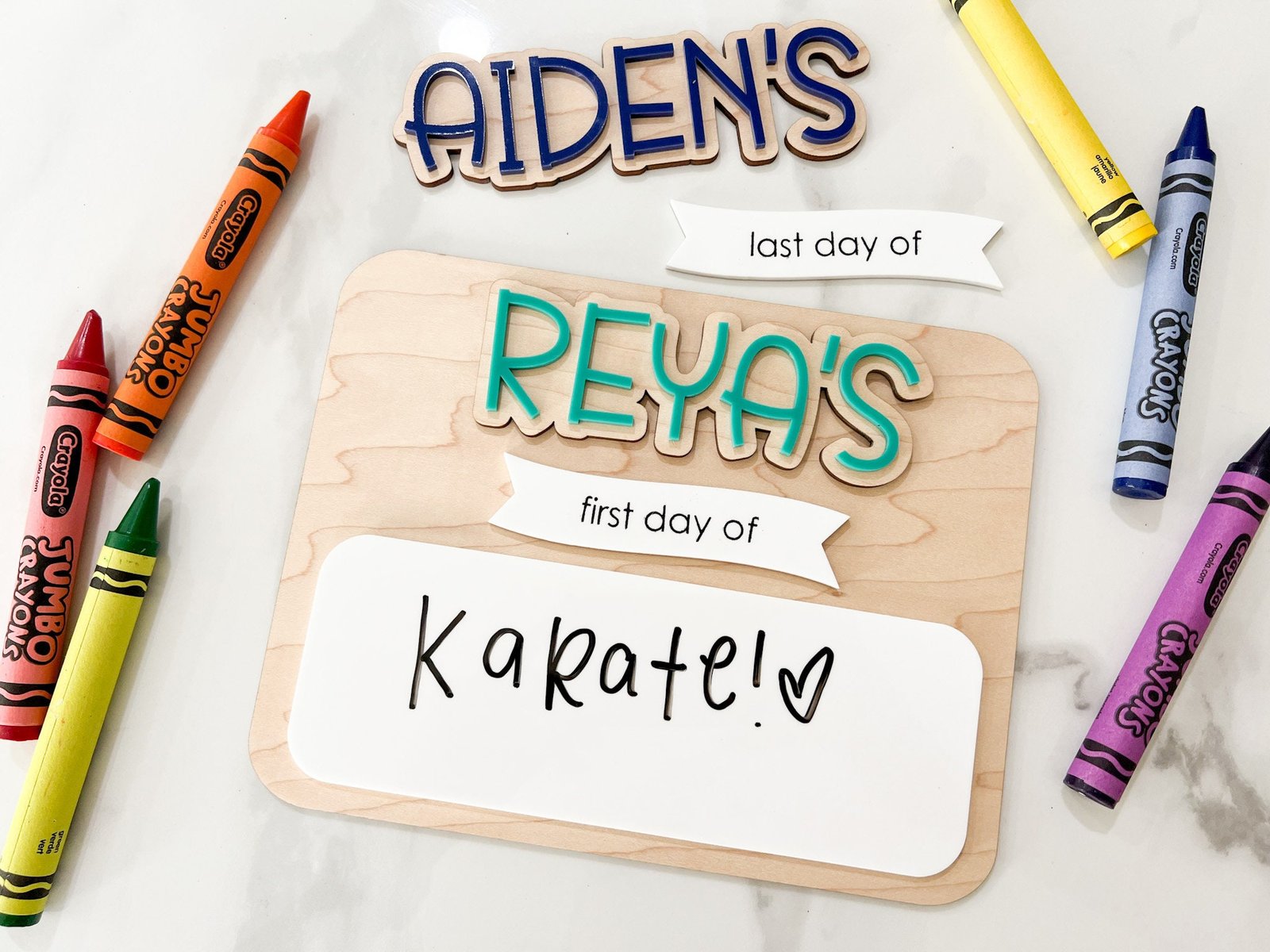 Each board comes with interchangeable headers: “First Day Of” and “Last Day Of”, letting you use it twice a year without buying a new sign.