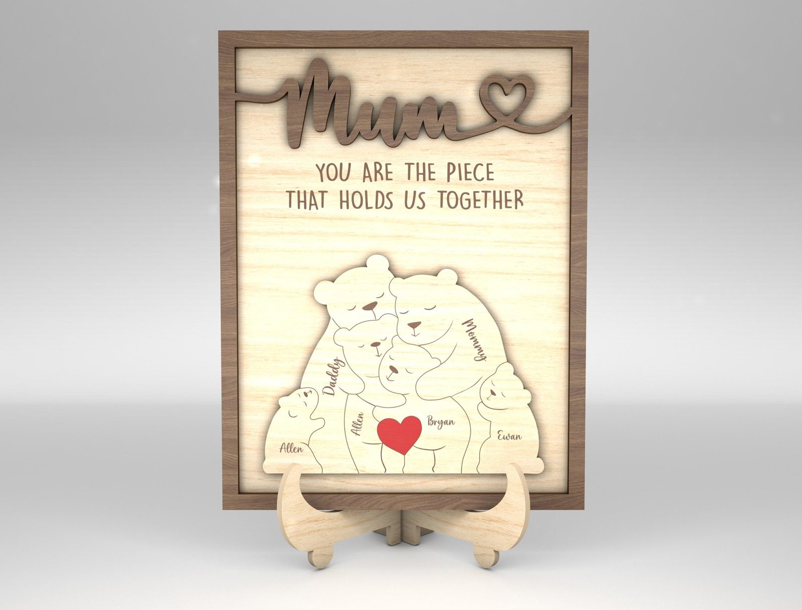 - Create a personalized wooden sign with the puzzle bear featuring each family member’s name.