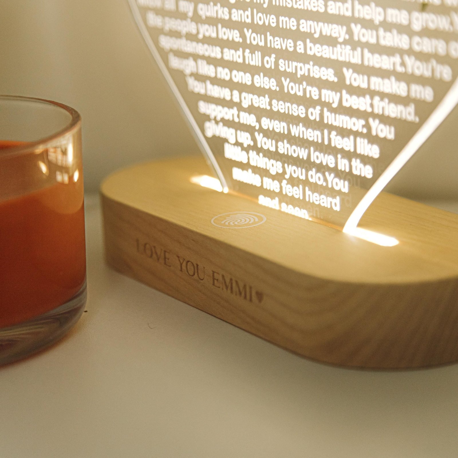 Give the gift of illumination and love with a custom heart night light that is perfect for Christmas, a special 30th birthday celebration, a romantic gesture, or a sentimental anniversary. This personalized night light will light up her space and heart with its warm glow, symbolizing the depth of your affection and creating a charming ambiance that speaks volumes of your love for her. Let this heart-shaped night light be a token of your eternal love and appreciation for her.